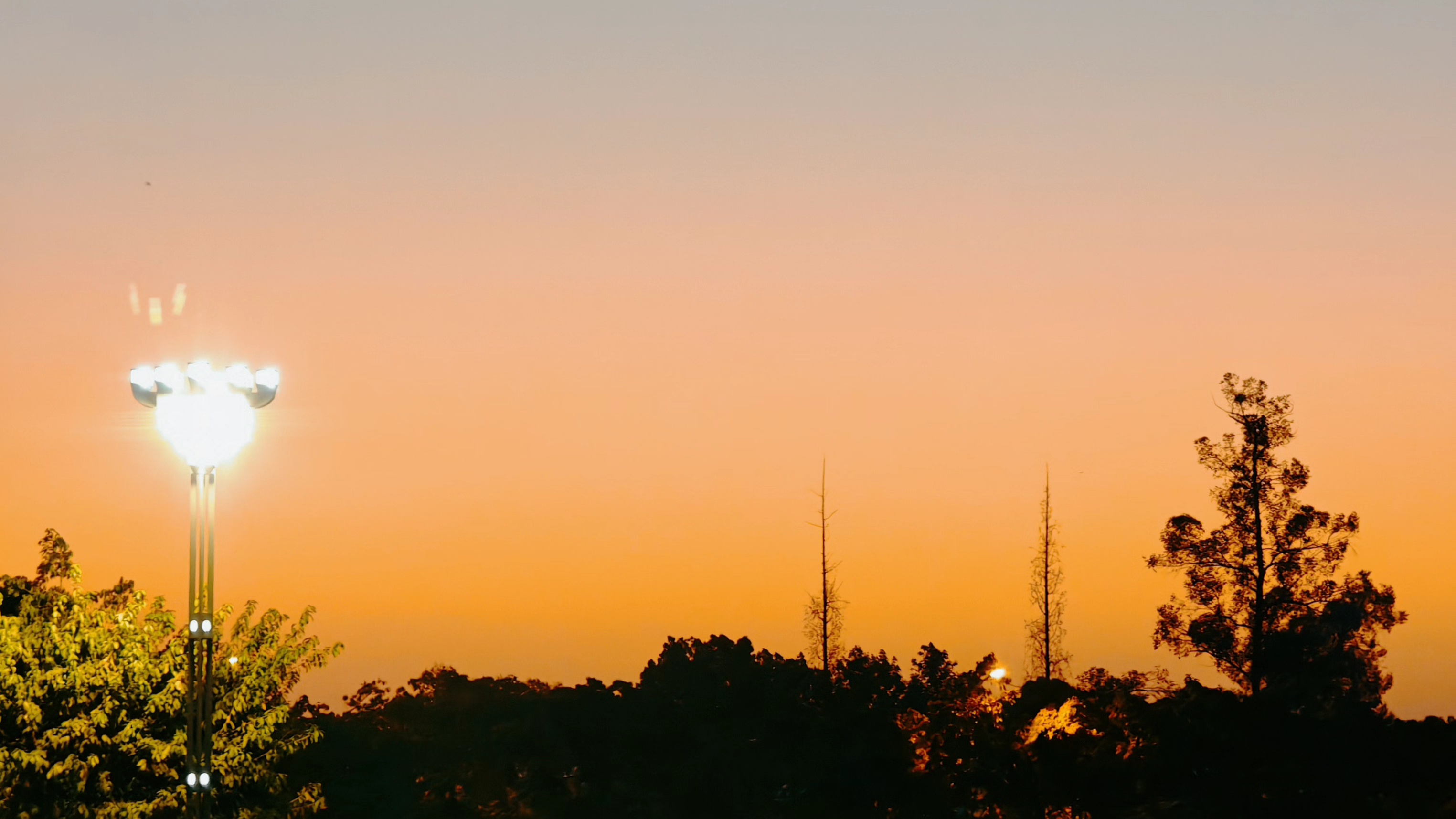 南门晚霞黄昏晚霞层渐染,一抹灯白橘黄橙