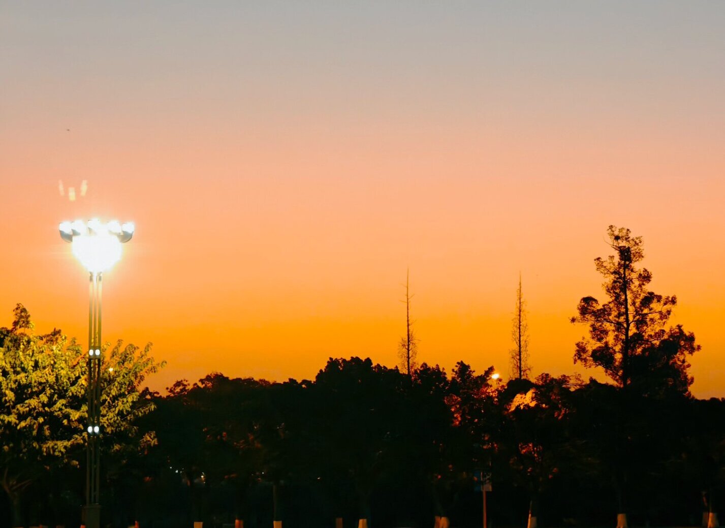学校晚霞黄昏晚霞层渐染,一抹灯白橘黄橙